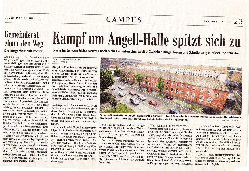 (BZ vom 21.06.2007 Formal korrekt, politisch ungeschickt; BZ vom 26.06.2007 Forum droht mit Einspruch; weitere Artikel vom Juli 2007Artikel vom Juli 2007; Der Sonntag, 22.07.2007 Räte falsch informiert?; BZ vom 15.09.2007 Halle wird kein "fauler Kompromiss"; BZ vom 07.12.2007 Kampf um Angell-Halle spitzt sich zu; Leserbrief 1; 2; 3; 4)